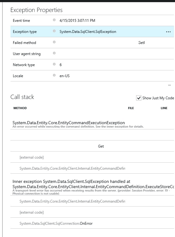 The code: Given that we just wanted to get started with Application Insights, we want to track requests and exceptions using the most basic telemetry. As I started to write the code for instrumenting data, I’ve approached my peer dev to see if she wants to pair on this. Luckily she already has stash (in GIT terms) or shelved (in TFS terms) telemetry code. I have to give Kudos to one our Devs who mostly did the work. Thank you Nemo Hajiyusuf!