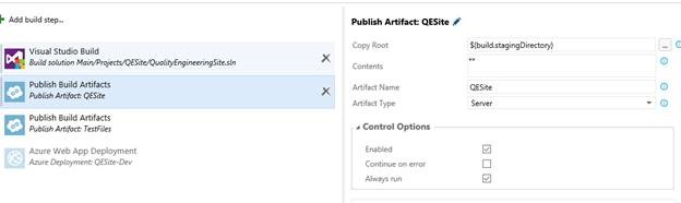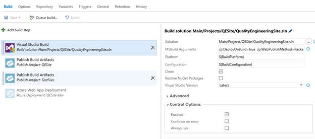 /p:DeployOnBuild=true /p:WebPublishMethod=Package /p:PackageAsSingleFile=true /p:SkipInvalidConfigurations=true /p:PackageLocation=”$(build.stagingDirectory)\QESite.zip”