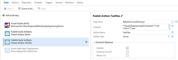 While you may have your app building appropriately with associated tests (in my case a Web App hosted on Azure), it’s important that you properly define your build definition (tasks) with the proper deployment and test files.