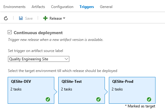 It’s important that you select the box for Continuous Deployment. After all, this is what we want to achieve. Any new build that gets triggered from your build definition will now trigger your deployment for the environments specified.