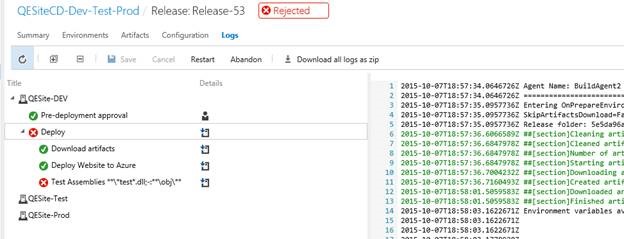 In an event that a deployment failed in one of your environments (likely due to a failing test), the deployment process will stop at the point of failure. In my case, the Dev environment. Both Test and Prod are left untouched.
